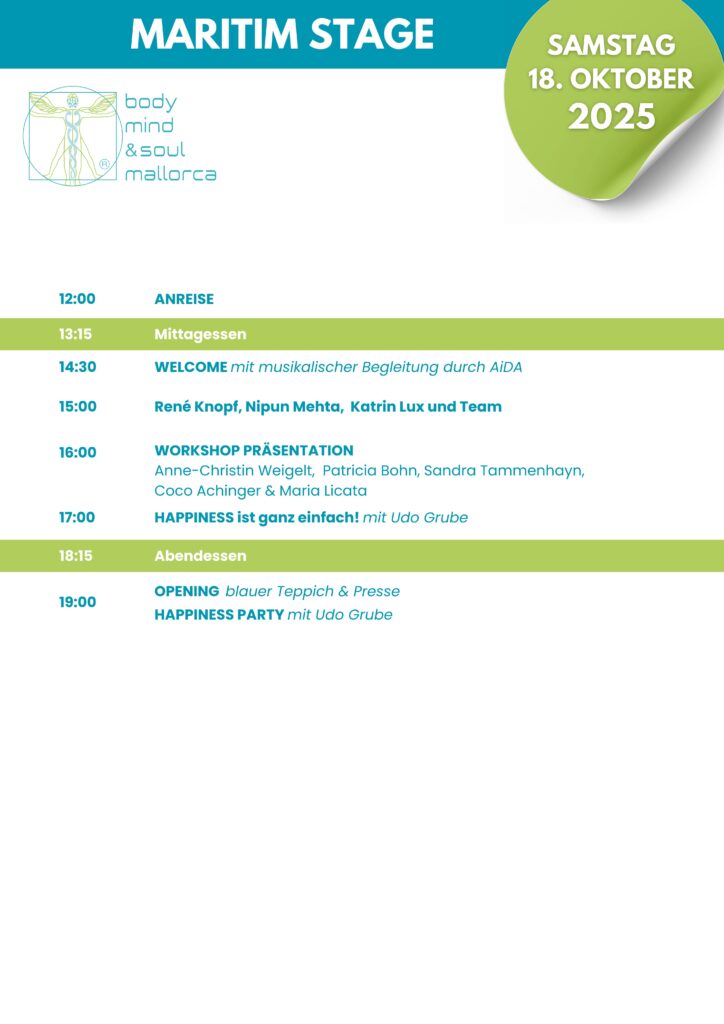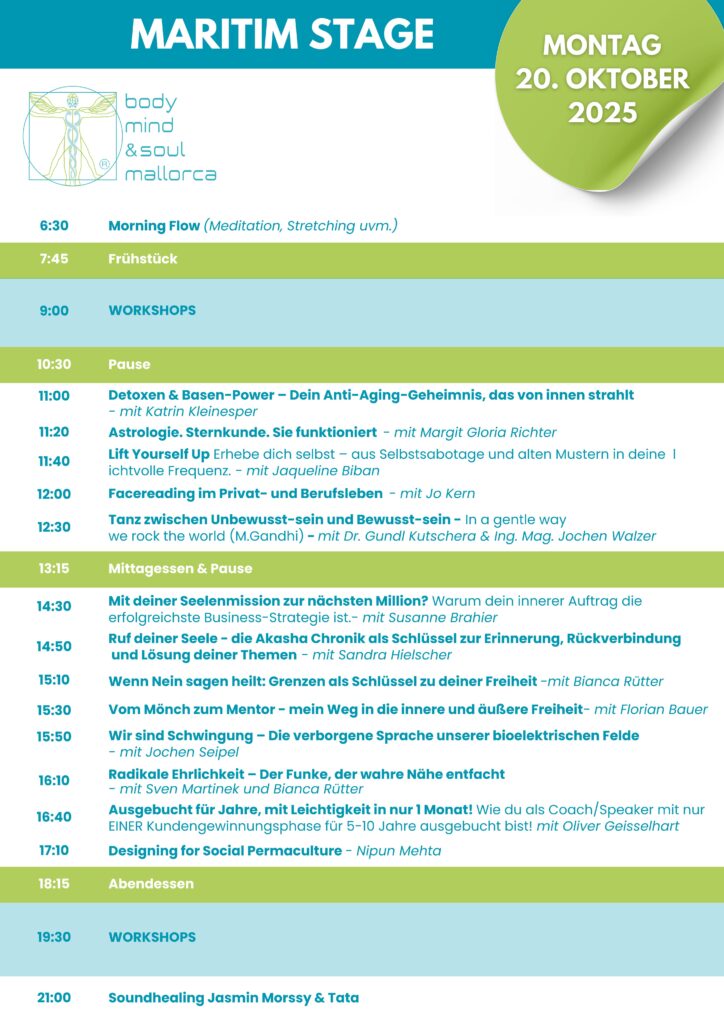 Vom 18. bis 23. Oktober 2025 erwarten dich beim Body Mind & Soul Festival täglich kuratierte Workshops, Keynotes, Healing Sessions, Musik und gemeinschaftliche Rituale. Direkt im Anschluss (24.–26. Oktober) findet das Retreat mit Dr. Ruediger Dahlke statt.